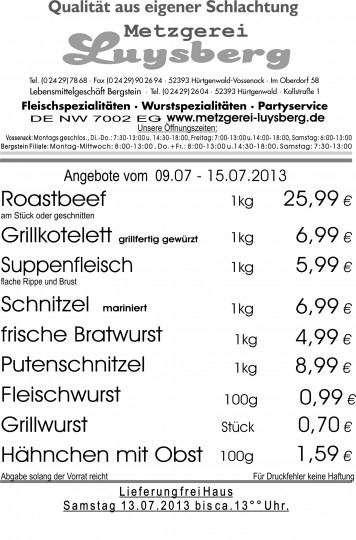 Deprecated: Die Funktion WP_Dependencies->add_data() wurde mit einem Argument aufgerufen, das seit Version 6.9.0 veraltet ist! Conditional Comments für den Internet Explorer werden von allen unterstützten Browsern ignoriert. in /var/www/vhosts/metzgerei-luysberg.de/httpdocs/wp-includes/functions.php on line 6131 09.07.-15.07.13 – Metzgerei LuysbergZum Inhalt springen