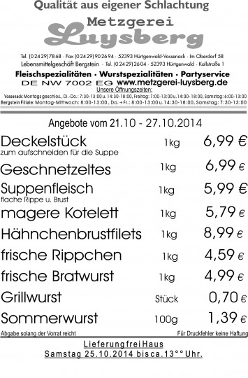 Deprecated: Die Funktion WP_Dependencies->add_data() wurde mit einem Argument aufgerufen, das seit Version 6.9.0 veraltet ist! Conditional Comments für den Internet Explorer werden von allen unterstützten Browsern ignoriert. in /var/www/vhosts/metzgerei-luysberg.de/httpdocs/wp-includes/functions.php on line 6131 21.10.-27.10.14 – Metzgerei LuysbergZum Inhalt springen