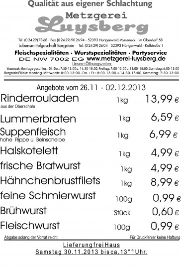 Deprecated: Die Funktion WP_Dependencies->add_data() wurde mit einem Argument aufgerufen, das seit Version 6.9.0 veraltet ist! Conditional Comments für den Internet Explorer werden von allen unterstützten Browsern ignoriert. in /var/www/vhosts/metzgerei-luysberg.de/httpdocs/wp-includes/functions.php on line 6131 26.11.-02.12.13 – Metzgerei LuysbergZum Inhalt springen