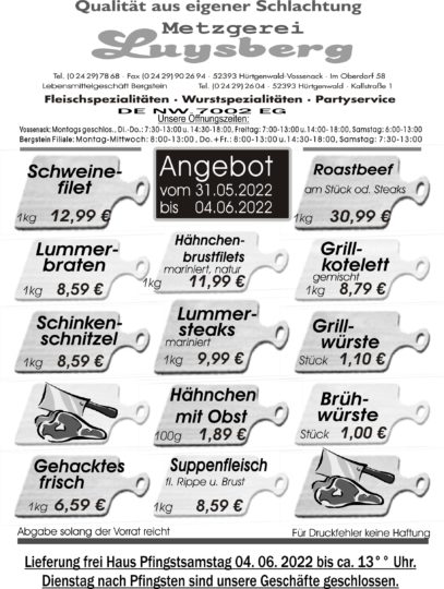 Deprecated: Die Funktion WP_Dependencies->add_data() wurde mit einem Argument aufgerufen, das seit Version 6.9.0 veraltet ist! Conditional Comments für den Internet Explorer werden von allen unterstützten Browsern ignoriert. in /var/www/vhosts/metzgerei-luysberg.de/httpdocs/wp-includes/functions.php on line 6131 Angebot Pfingsten 31.05.-04.06.22 – Metzgerei LuysbergZum Inhalt springen