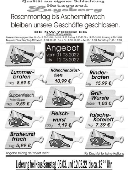 Deprecated: Die Funktion WP_Dependencies->add_data() wurde mit einem Argument aufgerufen, das seit Version 6.9.0 veraltet ist! Conditional Comments für den Internet Explorer werden von allen unterstützten Browsern ignoriert. in /var/www/vhosts/metzgerei-luysberg.de/httpdocs/wp-includes/functions.php on line 6131 Angebot vom 01.03.-12.03.22 – Metzgerei LuysbergZum Inhalt springen
