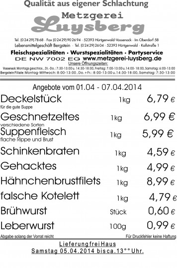 Angebot vom 01.04-07.04.14 – Metzgerei Luysberg
