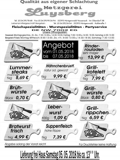 Deprecated: Die Funktion WP_Dependencies->add_data() wurde mit einem Argument aufgerufen, das seit Version 6.9.0 veraltet ist! Conditional Comments für den Internet Explorer werden von allen unterstützten Browsern ignoriert. in /var/www/vhosts/metzgerei-luysberg.de/httpdocs/wp-includes/functions.php on line 6131 Angebot vom 01.05.-07.0518 – Metzgerei LuysbergZum Inhalt springen