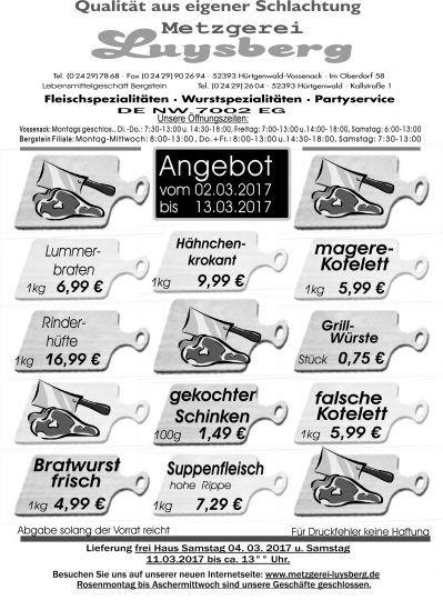 Deprecated: Die Funktion WP_Dependencies->add_data() wurde mit einem Argument aufgerufen, das seit Version 6.9.0 veraltet ist! Conditional Comments für den Internet Explorer werden von allen unterstützten Browsern ignoriert. in /var/www/vhosts/metzgerei-luysberg.de/httpdocs/wp-includes/functions.php on line 6131 Angebot vom 02.03.-13.03.17 – Metzgerei LuysbergZum Inhalt springen