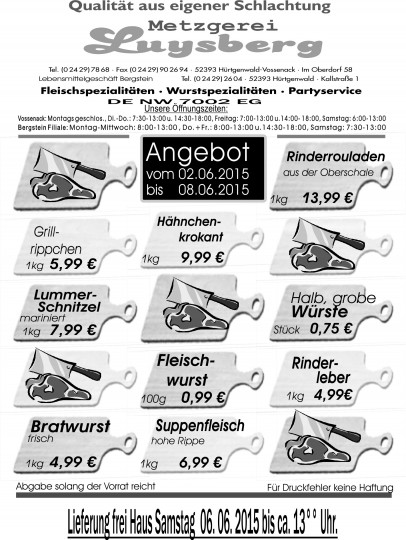 Deprecated: Die Funktion WP_Dependencies->add_data() wurde mit einem Argument aufgerufen, das seit Version 6.9.0 veraltet ist! Conditional Comments für den Internet Explorer werden von allen unterstützten Browsern ignoriert. in /var/www/vhosts/metzgerei-luysberg.de/httpdocs/wp-includes/functions.php on line 6131 Angebot vom 02.06.-08.06.15 – Metzgerei LuysbergZum Inhalt springen