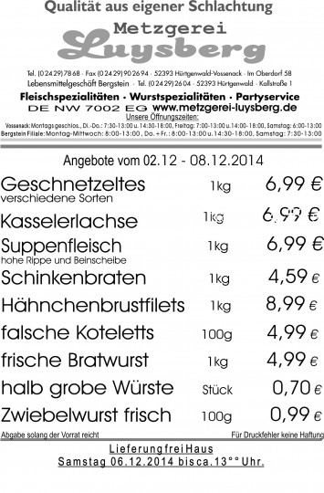 Deprecated: Die Funktion WP_Dependencies->add_data() wurde mit einem Argument aufgerufen, das seit Version 6.9.0 veraltet ist! Conditional Comments für den Internet Explorer werden von allen unterstützten Browsern ignoriert. in /var/www/vhosts/metzgerei-luysberg.de/httpdocs/wp-includes/functions.php on line 6131 Angebot vom 02.12.-08.12.14 – Metzgerei LuysbergZum Inhalt springen