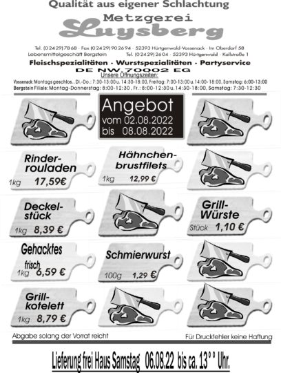 Deprecated: Die Funktion WP_Dependencies->add_data() wurde mit einem Argument aufgerufen, das seit Version 6.9.0 veraltet ist! Conditional Comments für den Internet Explorer werden von allen unterstützten Browsern ignoriert. in /var/www/vhosts/metzgerei-luysberg.de/httpdocs/wp-includes/functions.php on line 6131 Angebot vom 02.08.-08.08.22 – Metzgerei LuysbergZum Inhalt springen