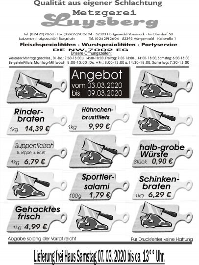 Deprecated: Die Funktion WP_Dependencies->add_data() wurde mit einem Argument aufgerufen, das seit Version 6.9.0 veraltet ist! Conditional Comments für den Internet Explorer werden von allen unterstützten Browsern ignoriert. in /var/www/vhosts/metzgerei-luysberg.de/httpdocs/wp-includes/functions.php on line 6131 Angebot vom 03.03.-09.03.20 – Metzgerei LuysbergZum Inhalt springen