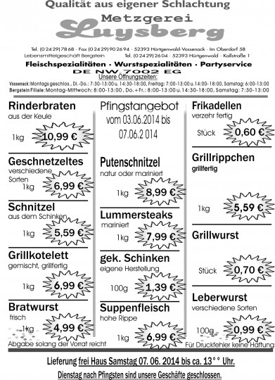 Deprecated: Die Funktion WP_Dependencies->add_data() wurde mit einem Argument aufgerufen, das seit Version 6.9.0 veraltet ist! Conditional Comments für den Internet Explorer werden von allen unterstützten Browsern ignoriert. in /var/www/vhosts/metzgerei-luysberg.de/httpdocs/wp-includes/functions.php on line 6131 Angebot vom 03.06-07.06.14 – Metzgerei LuysbergZum Inhalt springen