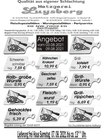 Deprecated: Die Funktion WP_Dependencies->add_data() wurde mit einem Argument aufgerufen, das seit Version 6.9.0 veraltet ist! Conditional Comments für den Internet Explorer werden von allen unterstützten Browsern ignoriert. in /var/www/vhosts/metzgerei-luysberg.de/httpdocs/wp-includes/functions.php on line 6131 Angebot vom 03.08.-09.08.21 – Metzgerei LuysbergZum Inhalt springen