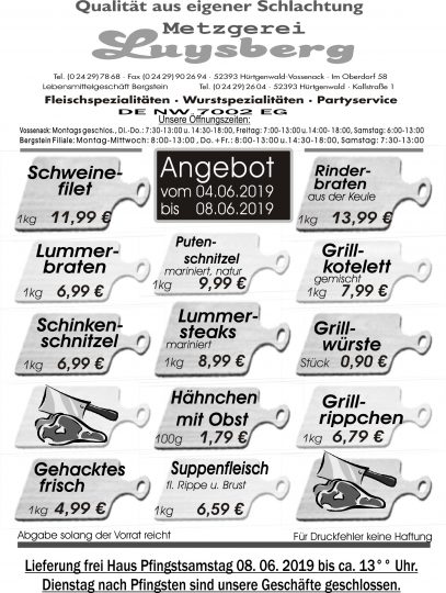 Deprecated: Die Funktion WP_Dependencies->add_data() wurde mit einem Argument aufgerufen, das seit Version 6.9.0 veraltet ist! Conditional Comments für den Internet Explorer werden von allen unterstützten Browsern ignoriert. in /var/www/vhosts/metzgerei-luysberg.de/httpdocs/wp-includes/functions.php on line 6131 Angebot vom 04.06.-08.06.19 – Metzgerei LuysbergZum Inhalt springen