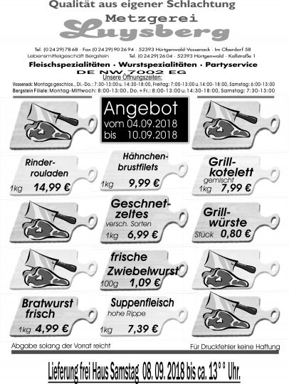 Deprecated: Die Funktion WP_Dependencies->add_data() wurde mit einem Argument aufgerufen, das seit Version 6.9.0 veraltet ist! Conditional Comments für den Internet Explorer werden von allen unterstützten Browsern ignoriert. in /var/www/vhosts/metzgerei-luysberg.de/httpdocs/wp-includes/functions.php on line 6131 Angebot vom 04.09.-10.09.2018 – Metzgerei LuysbergZum Inhalt springen