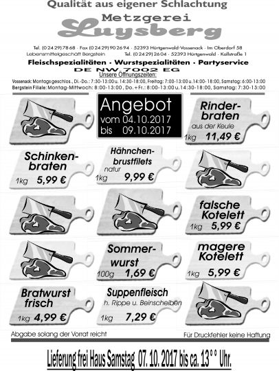 Deprecated: Die Funktion WP_Dependencies->add_data() wurde mit einem Argument aufgerufen, das seit Version 6.9.0 veraltet ist! Conditional Comments für den Internet Explorer werden von allen unterstützten Browsern ignoriert. in /var/www/vhosts/metzgerei-luysberg.de/httpdocs/wp-includes/functions.php on line 6131 Angebot vom 04.10.-09.10.17 – Metzgerei LuysbergZum Inhalt springen