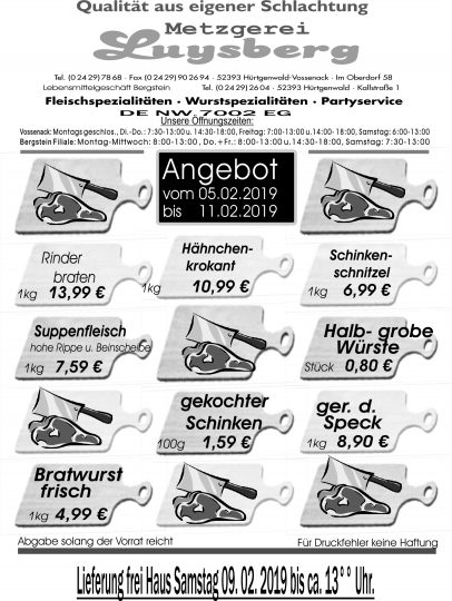 Deprecated: Die Funktion WP_Dependencies->add_data() wurde mit einem Argument aufgerufen, das seit Version 6.9.0 veraltet ist! Conditional Comments für den Internet Explorer werden von allen unterstützten Browsern ignoriert. in /var/www/vhosts/metzgerei-luysberg.de/httpdocs/wp-includes/functions.php on line 6131 Angebot vom 05.02.-11.02.19 – Metzgerei LuysbergZum Inhalt springen