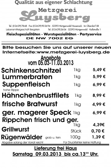 Deprecated: Die Funktion WP_Dependencies->add_data() wurde mit einem Argument aufgerufen, das seit Version 6.9.0 veraltet ist! Conditional Comments für den Internet Explorer werden von allen unterstützten Browsern ignoriert. in /var/www/vhosts/metzgerei-luysberg.de/httpdocs/wp-includes/functions.php on line 6131 Angebot vom 05.03.-11.03.13 – Metzgerei LuysbergZum Inhalt springen