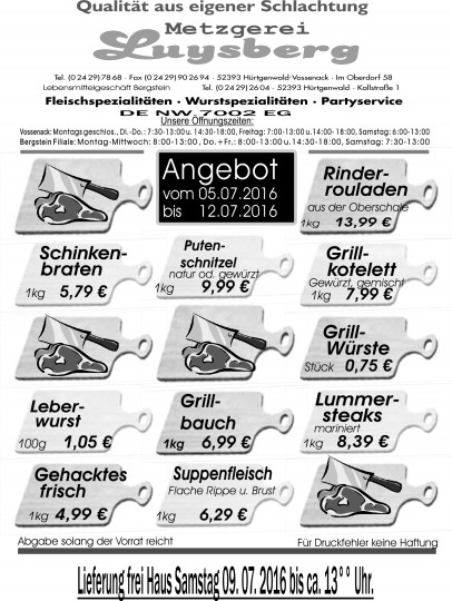 Deprecated: Die Funktion WP_Dependencies->add_data() wurde mit einem Argument aufgerufen, das seit Version 6.9.0 veraltet ist! Conditional Comments für den Internet Explorer werden von allen unterstützten Browsern ignoriert. in /var/www/vhosts/metzgerei-luysberg.de/httpdocs/wp-includes/functions.php on line 6131 Angebot vom 05.07.-12.07.16 – Metzgerei LuysbergZum Inhalt springen