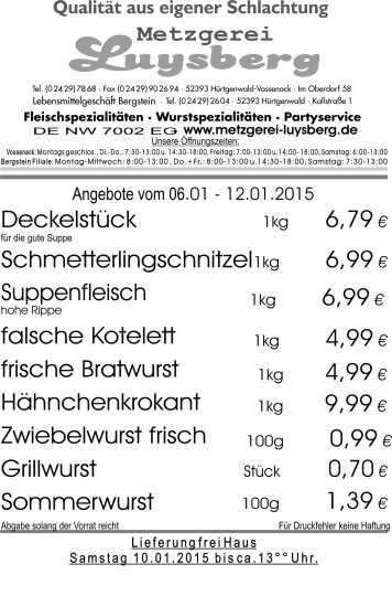Deprecated: Die Funktion WP_Dependencies->add_data() wurde mit einem Argument aufgerufen, das seit Version 6.9.0 veraltet ist! Conditional Comments für den Internet Explorer werden von allen unterstützten Browsern ignoriert. in /var/www/vhosts/metzgerei-luysberg.de/httpdocs/wp-includes/functions.php on line 6131 Angebot vom 06.01.-12.01.15 – Metzgerei LuysbergZum Inhalt springen