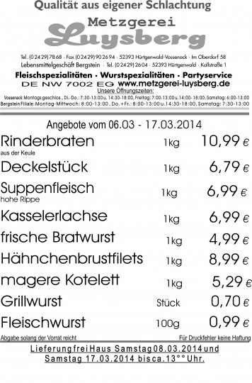Deprecated: Die Funktion WP_Dependencies->add_data() wurde mit einem Argument aufgerufen, das seit Version 6.9.0 veraltet ist! Conditional Comments für den Internet Explorer werden von allen unterstützten Browsern ignoriert. in /var/www/vhosts/metzgerei-luysberg.de/httpdocs/wp-includes/functions.php on line 6131 Angebot vom 06.03-17.03.14 – Metzgerei LuysbergZum Inhalt springen