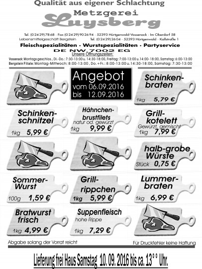 Deprecated: Die Funktion WP_Dependencies->add_data() wurde mit einem Argument aufgerufen, das seit Version 6.9.0 veraltet ist! Conditional Comments für den Internet Explorer werden von allen unterstützten Browsern ignoriert. in /var/www/vhosts/metzgerei-luysberg.de/httpdocs/wp-includes/functions.php on line 6131 Angebot vom 06.09.-12.09.16 – Metzgerei LuysbergZum Inhalt springen