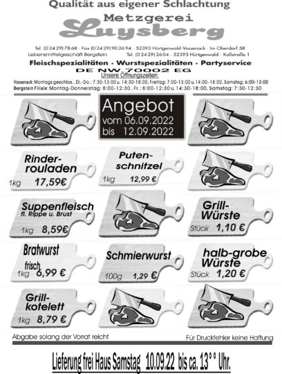 Deprecated: Die Funktion WP_Dependencies->add_data() wurde mit einem Argument aufgerufen, das seit Version 6.9.0 veraltet ist! Conditional Comments für den Internet Explorer werden von allen unterstützten Browsern ignoriert. in /var/www/vhosts/metzgerei-luysberg.de/httpdocs/wp-includes/functions.php on line 6131 Angebot vom 06.09.-12.09.22 – Metzgerei LuysbergZum Inhalt springen