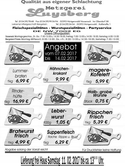 Deprecated: Die Funktion WP_Dependencies->add_data() wurde mit einem Argument aufgerufen, das seit Version 6.9.0 veraltet ist! Conditional Comments für den Internet Explorer werden von allen unterstützten Browsern ignoriert. in /var/www/vhosts/metzgerei-luysberg.de/httpdocs/wp-includes/functions.php on line 6131 Angebot vom 07.02.-14.02.2017 – Metzgerei LuysbergZum Inhalt springen