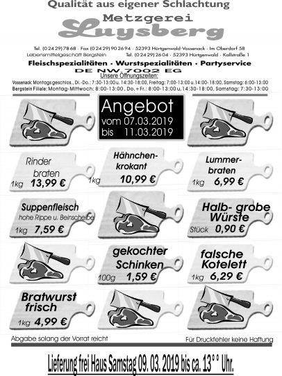 Deprecated: Die Funktion WP_Dependencies->add_data() wurde mit einem Argument aufgerufen, das seit Version 6.9.0 veraltet ist! Conditional Comments für den Internet Explorer werden von allen unterstützten Browsern ignoriert. in /var/www/vhosts/metzgerei-luysberg.de/httpdocs/wp-includes/functions.php on line 6131 Angebot vom 07.03.-11.03.19 – Metzgerei LuysbergZum Inhalt springen