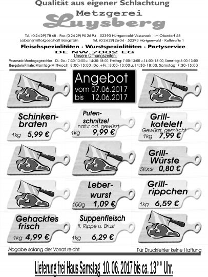 Deprecated: Die Funktion WP_Dependencies->add_data() wurde mit einem Argument aufgerufen, das seit Version 6.9.0 veraltet ist! Conditional Comments für den Internet Explorer werden von allen unterstützten Browsern ignoriert. in /var/www/vhosts/metzgerei-luysberg.de/httpdocs/wp-includes/functions.php on line 6131 Angebot vom 07.06-12.06.17 – Metzgerei LuysbergZum Inhalt springen