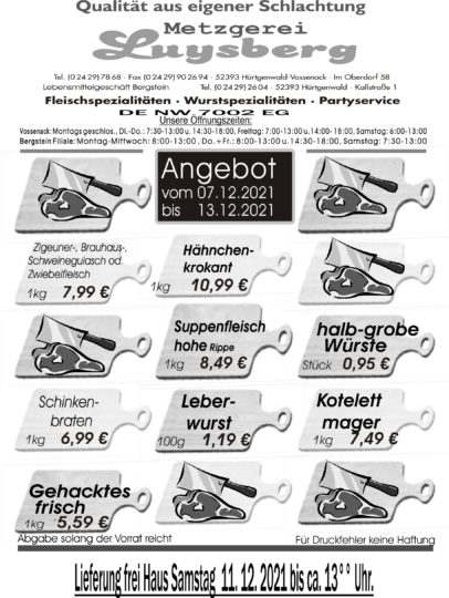 Deprecated: Die Funktion WP_Dependencies->add_data() wurde mit einem Argument aufgerufen, das seit Version 6.9.0 veraltet ist! Conditional Comments für den Internet Explorer werden von allen unterstützten Browsern ignoriert. in /var/www/vhosts/metzgerei-luysberg.de/httpdocs/wp-includes/functions.php on line 6131 Angebot vom 07.12.-13.12.2021 – Metzgerei LuysbergZum Inhalt springen