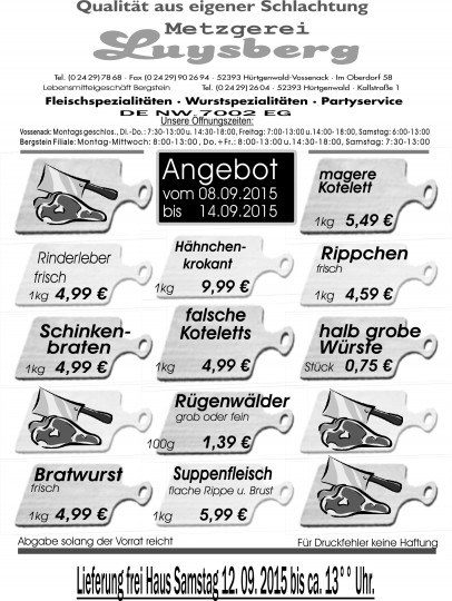 Deprecated: Die Funktion WP_Dependencies->add_data() wurde mit einem Argument aufgerufen, das seit Version 6.9.0 veraltet ist! Conditional Comments für den Internet Explorer werden von allen unterstützten Browsern ignoriert. in /var/www/vhosts/metzgerei-luysberg.de/httpdocs/wp-includes/functions.php on line 6131 Angebot vom 08.09-14.09.15 – Metzgerei LuysbergZum Inhalt springen