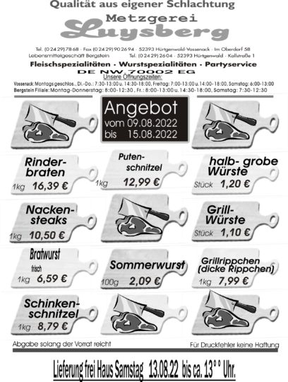 Deprecated: Die Funktion WP_Dependencies->add_data() wurde mit einem Argument aufgerufen, das seit Version 6.9.0 veraltet ist! Conditional Comments für den Internet Explorer werden von allen unterstützten Browsern ignoriert. in /var/www/vhosts/metzgerei-luysberg.de/httpdocs/wp-includes/functions.php on line 6131 Angebot vom 09.08.-15.08.2022 – Metzgerei LuysbergZum Inhalt springen