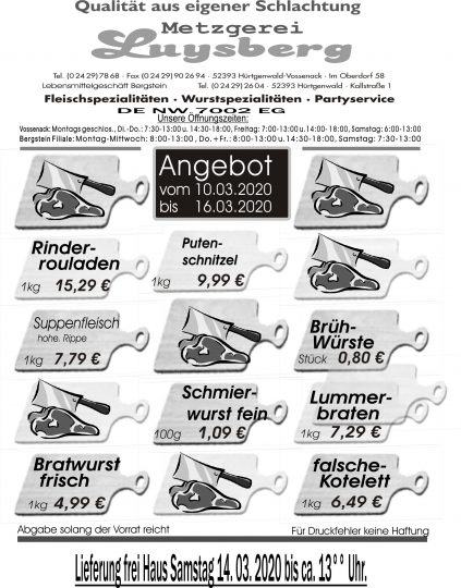 Deprecated: Die Funktion WP_Dependencies->add_data() wurde mit einem Argument aufgerufen, das seit Version 6.9.0 veraltet ist! Conditional Comments für den Internet Explorer werden von allen unterstützten Browsern ignoriert. in /var/www/vhosts/metzgerei-luysberg.de/httpdocs/wp-includes/functions.php on line 6131 Angebot vom 10.03.-16.03.20 – Metzgerei LuysbergZum Inhalt springen