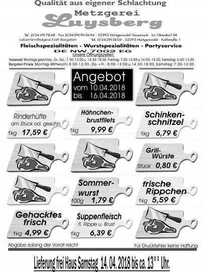 Deprecated: Die Funktion WP_Dependencies->add_data() wurde mit einem Argument aufgerufen, das seit Version 6.9.0 veraltet ist! Conditional Comments für den Internet Explorer werden von allen unterstützten Browsern ignoriert. in /var/www/vhosts/metzgerei-luysberg.de/httpdocs/wp-includes/functions.php on line 6131 Angebot vom 10.04.-16.04.18 – Metzgerei LuysbergZum Inhalt springen
