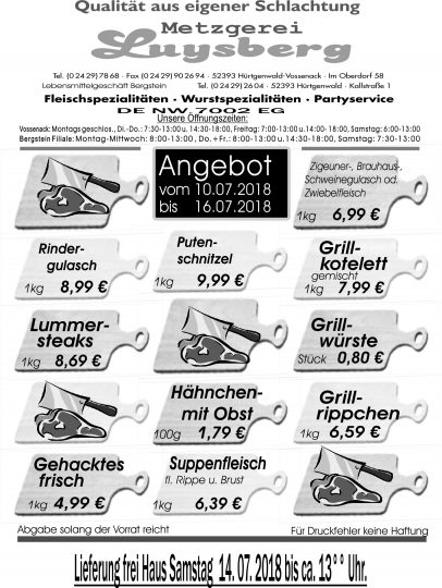 Deprecated: Die Funktion WP_Dependencies->add_data() wurde mit einem Argument aufgerufen, das seit Version 6.9.0 veraltet ist! Conditional Comments für den Internet Explorer werden von allen unterstützten Browsern ignoriert. in /var/www/vhosts/metzgerei-luysberg.de/httpdocs/wp-includes/functions.php on line 6131 Angebot vom 10.07.-16.07.18 – Metzgerei LuysbergZum Inhalt springen