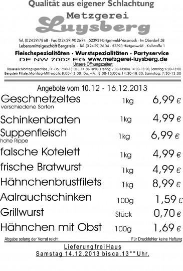Deprecated: Die Funktion WP_Dependencies->add_data() wurde mit einem Argument aufgerufen, das seit Version 6.9.0 veraltet ist! Conditional Comments für den Internet Explorer werden von allen unterstützten Browsern ignoriert. in /var/www/vhosts/metzgerei-luysberg.de/httpdocs/wp-includes/functions.php on line 6131 Angebot vom 10.12-16.12.13 – Metzgerei LuysbergZum Inhalt springen
