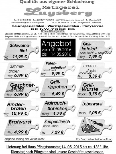 Deprecated: Die Funktion WP_Dependencies->add_data() wurde mit einem Argument aufgerufen, das seit Version 6.9.0 veraltet ist! Conditional Comments für den Internet Explorer werden von allen unterstützten Browsern ignoriert. in /var/www/vhosts/metzgerei-luysberg.de/httpdocs/wp-includes/functions.php on line 6131 Angebot vom 10.-14.05.16 – Metzgerei LuysbergZum Inhalt springen