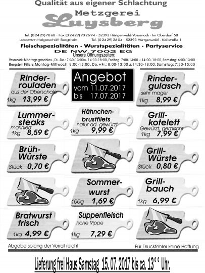 Deprecated: Die Funktion WP_Dependencies->add_data() wurde mit einem Argument aufgerufen, das seit Version 6.9.0 veraltet ist! Conditional Comments für den Internet Explorer werden von allen unterstützten Browsern ignoriert. in /var/www/vhosts/metzgerei-luysberg.de/httpdocs/wp-includes/functions.php on line 6131 Angebot vom 11.07.-17.07.17 – Metzgerei LuysbergZum Inhalt springen