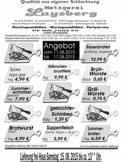Angebot vom 11.08.-17.08.15 – Metzgerei Luysberg