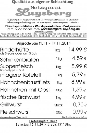 Deprecated: Die Funktion WP_Dependencies->add_data() wurde mit einem Argument aufgerufen, das seit Version 6.9.0 veraltet ist! Conditional Comments für den Internet Explorer werden von allen unterstützten Browsern ignoriert. in /var/www/vhosts/metzgerei-luysberg.de/httpdocs/wp-includes/functions.php on line 6131 Angebot vom 11.11-17.11.14 – Metzgerei LuysbergZum Inhalt springen