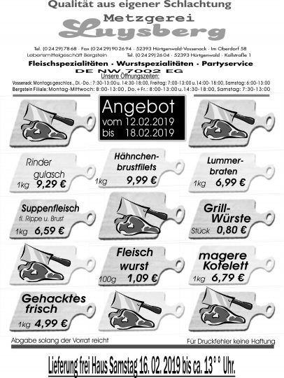 Deprecated: Die Funktion WP_Dependencies->add_data() wurde mit einem Argument aufgerufen, das seit Version 6.9.0 veraltet ist! Conditional Comments für den Internet Explorer werden von allen unterstützten Browsern ignoriert. in /var/www/vhosts/metzgerei-luysberg.de/httpdocs/wp-includes/functions.php on line 6131 Angebot vom 12.02.-18.02.19 – Metzgerei LuysbergZum Inhalt springen