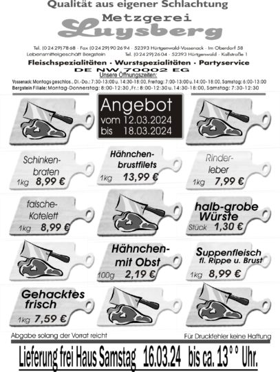 Deprecated: Die Funktion WP_Dependencies->add_data() wurde mit einem Argument aufgerufen, das seit Version 6.9.0 veraltet ist! Conditional Comments für den Internet Explorer werden von allen unterstützten Browsern ignoriert. in /var/www/vhosts/metzgerei-luysberg.de/httpdocs/wp-includes/functions.php on line 6131 Angebot vom 12.03.-18.03.24 – Metzgerei LuysbergZum Inhalt springen