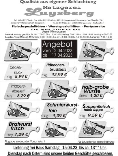 Deprecated: Die Funktion WP_Dependencies->add_data() wurde mit einem Argument aufgerufen, das seit Version 6.9.0 veraltet ist! Conditional Comments für den Internet Explorer werden von allen unterstützten Browsern ignoriert. in /var/www/vhosts/metzgerei-luysberg.de/httpdocs/wp-includes/functions.php on line 6131 Angebot vom 12.04.-17.04.23 – Metzgerei LuysbergZum Inhalt springen