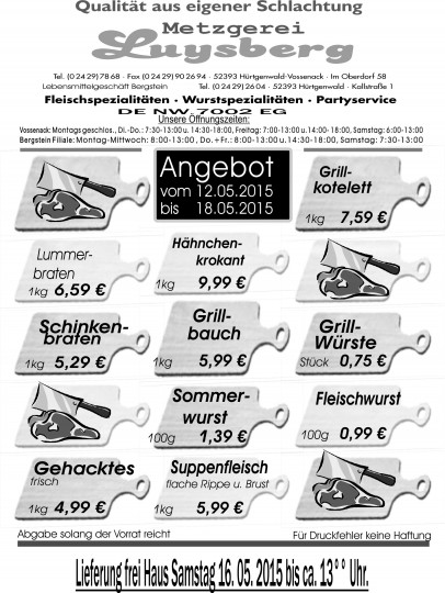 Deprecated: Die Funktion WP_Dependencies->add_data() wurde mit einem Argument aufgerufen, das seit Version 6.9.0 veraltet ist! Conditional Comments für den Internet Explorer werden von allen unterstützten Browsern ignoriert. in /var/www/vhosts/metzgerei-luysberg.de/httpdocs/wp-includes/functions.php on line 6131 Angebot vom 12.05.-18.05.15 – Metzgerei LuysbergZum Inhalt springen