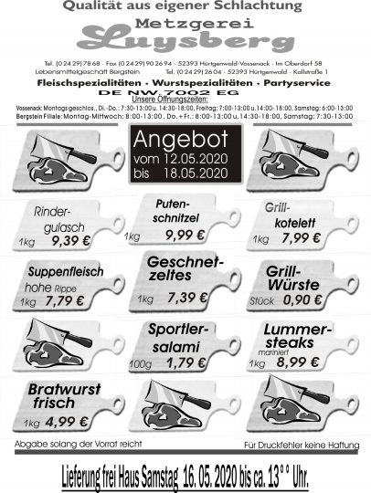 Deprecated: Die Funktion WP_Dependencies->add_data() wurde mit einem Argument aufgerufen, das seit Version 6.9.0 veraltet ist! Conditional Comments für den Internet Explorer werden von allen unterstützten Browsern ignoriert. in /var/www/vhosts/metzgerei-luysberg.de/httpdocs/wp-includes/functions.php on line 6131 Angebot vom 12.05.-18.05.2020 – Metzgerei LuysbergZum Inhalt springen