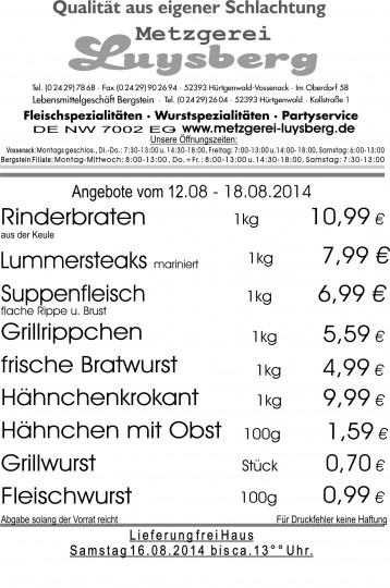 Angebot vom 12.08.-18.08.14 – Metzgerei Luysberg