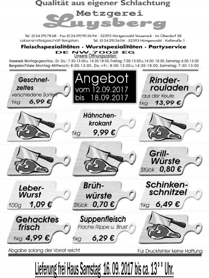 Deprecated: Die Funktion WP_Dependencies->add_data() wurde mit einem Argument aufgerufen, das seit Version 6.9.0 veraltet ist! Conditional Comments für den Internet Explorer werden von allen unterstützten Browsern ignoriert. in /var/www/vhosts/metzgerei-luysberg.de/httpdocs/wp-includes/functions.php on line 6131 Angebot vom 12.09.-18.09.17 – Metzgerei LuysbergZum Inhalt springen
