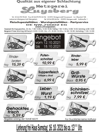 Deprecated: Die Funktion WP_Dependencies->add_data() wurde mit einem Argument aufgerufen, das seit Version 6.9.0 veraltet ist! Conditional Comments für den Internet Explorer werden von allen unterstützten Browsern ignoriert. in /var/www/vhosts/metzgerei-luysberg.de/httpdocs/wp-includes/functions.php on line 6131 Angebot vom 12.10.-18.10.21 – Metzgerei LuysbergZum Inhalt springen
