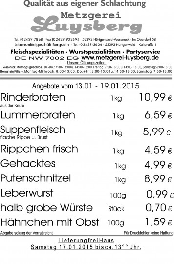 Angebot vom 13.01.-19.01.2015 – Metzgerei Luysberg