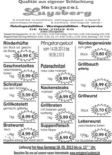 Deprecated: Die Funktion WP_Dependencies->add_data() wurde mit einem Argument aufgerufen, das seit Version 6.9.0 veraltet ist! Conditional Comments für den Internet Explorer werden von allen unterstützten Browsern ignoriert. in /var/www/vhosts/metzgerei-luysberg.de/httpdocs/wp-includes/functions.php on line 6131 Angebot vom 14.05.-18.05.13 – Metzgerei LuysbergZum Inhalt springen