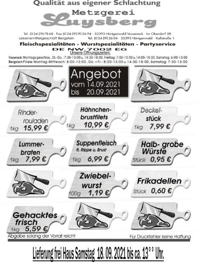 Deprecated: Die Funktion WP_Dependencies->add_data() wurde mit einem Argument aufgerufen, das seit Version 6.9.0 veraltet ist! Conditional Comments für den Internet Explorer werden von allen unterstützten Browsern ignoriert. in /var/www/vhosts/metzgerei-luysberg.de/httpdocs/wp-includes/functions.php on line 6131 Angebot vom 14.09.-20.09.21 – Metzgerei LuysbergZum Inhalt springen