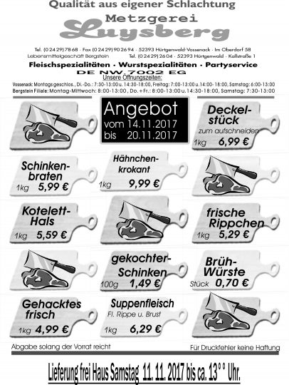 Deprecated: Die Funktion WP_Dependencies->add_data() wurde mit einem Argument aufgerufen, das seit Version 6.9.0 veraltet ist! Conditional Comments für den Internet Explorer werden von allen unterstützten Browsern ignoriert. in /var/www/vhosts/metzgerei-luysberg.de/httpdocs/wp-includes/functions.php on line 6131 Angebot vom 14.11.-20.11.17 – Metzgerei LuysbergZum Inhalt springen